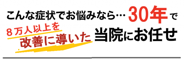 当院は、長年培った独自の施術法により30年間で8万千人以上のお客様のつらい症状を改善に導いてきました。お客様の中には、いくつもの院や病院に通っても改善されずに、諦めかけているお客様も多くいらっしゃいました。
