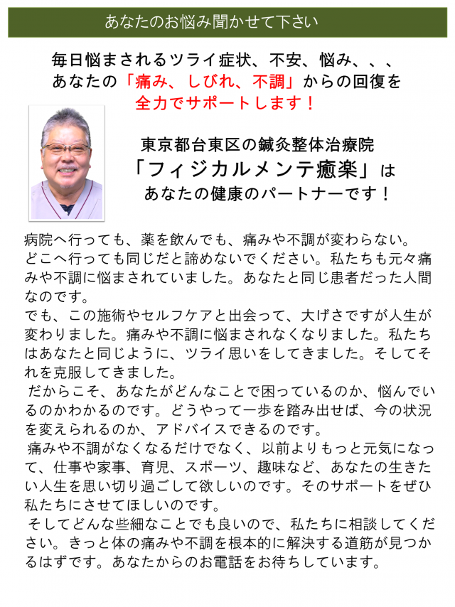 はじめまして! 台東区のフィジカルメンテ癒楽(鍼灸マッサージ治療院) 院長の室田です。
